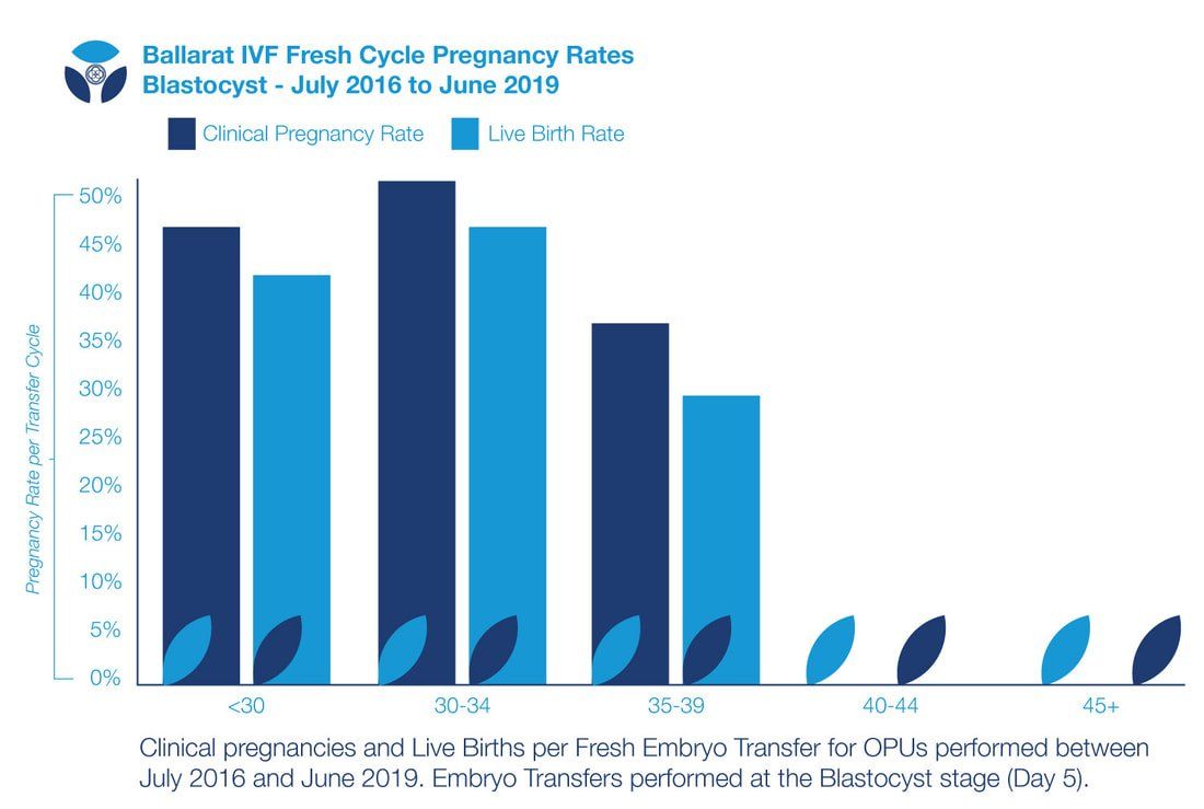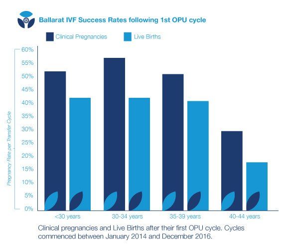 We are proud to report that the cumulative LIVE BIRTH rates after one stimulation cycle at Ballarat IVF between 2016 and 2019, was around 40%, and if a woman had a second IVF stimulation cycle, 70% of women achieved a live birth. Besides having a live birth, many of these women still have frozen embryos stored for their next pregnancy.